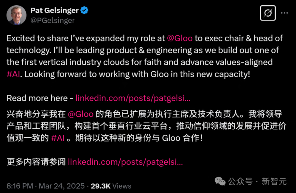 英特尔前CEO找到新工作!掌舵AI+信仰公司Gloo,还要制作激光器