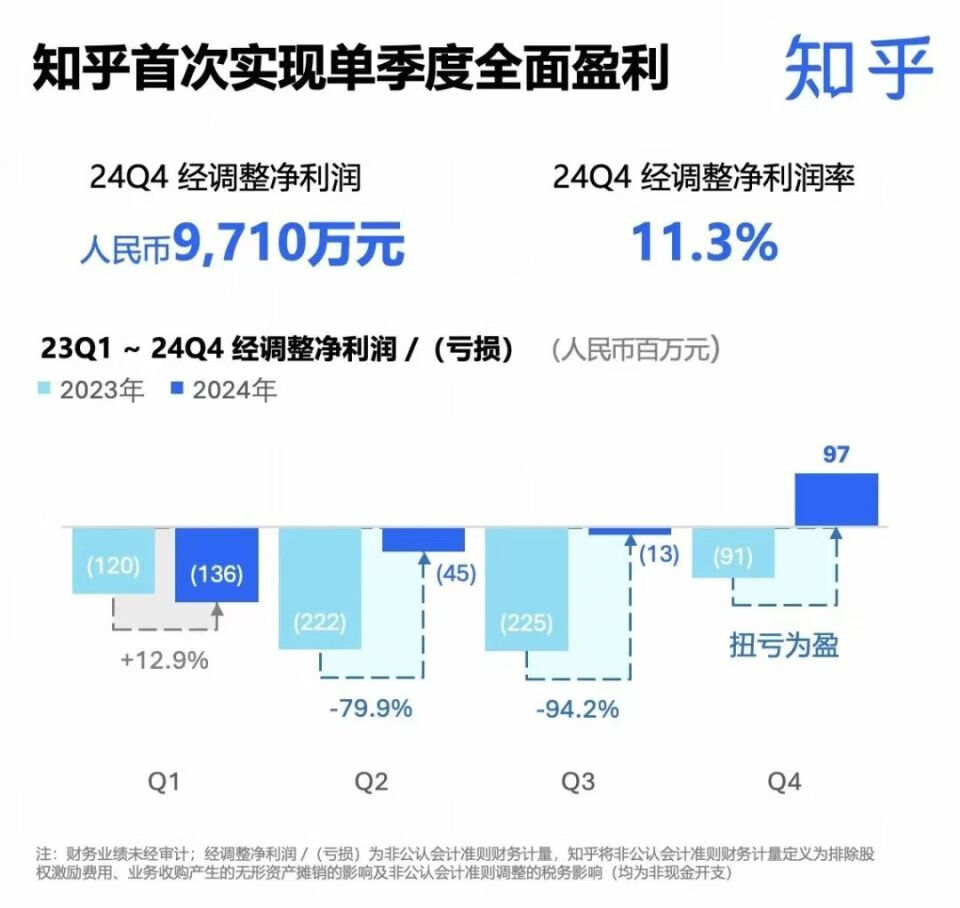 其中,2024年第四季度,知乎实现营收8.6亿元,净利润8640万元,2023年同期净亏损1.031亿元;调整后净利润9710万元,调整后经营利润2310万元,各项利润数据均超出市场预期。