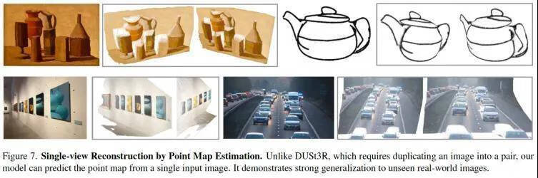 尽管 VGGT 从未接受单图训练,但仍展现出强大的跨任务泛化能力。研究团队公布的单图重建定性结果显示,VGGT 在未专门训练的单目任务中表现出色。