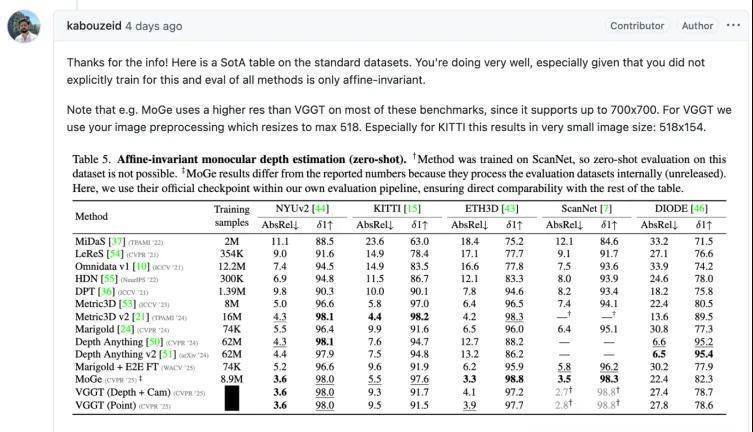 VGGT 的代码和模型公开后,迅速有 github 社区成员跟进,在标准的单目设置下进行测试。GitHub 社区测试显示,VGGT 在 NYU V2 等数据集上的表现已逼近单目 SOTA 水平,这一「意外之喜」进一步印证了 VGGT 作为通用 3D 基础模型的潜力。
