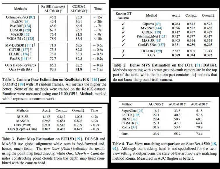 传统 3D 重建技术高度依赖束调整(Bundle Adjustment, BA)等几何优化方法,需反复迭代且计算成本高昂。尽管近年来机器学习被引入辅助优化,但仍难以摆脱复杂后处理的桎梏。VGGT 开创性地采用纯前馈设计:通过大规模 3D 标注数据与 Transformer 架构的结合,模型在一次前向传播中即可完成全部几何推理任务。实验表明,即便输入数百张图像,VGGT 仍能在数秒内输出高质量结果,在精度与速度上均超越传统优化方法。