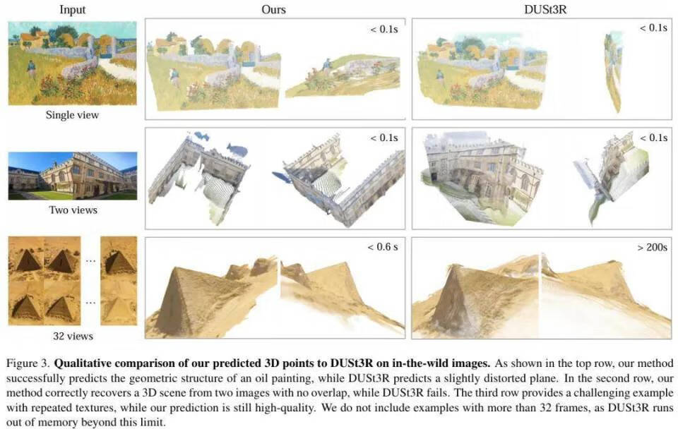 定性演示视频显示,VGGT 能轻松应对不同数量图像及复杂场景的重建。同时,研究人员提供了与过去 SOTA 的定性比较。VGGT 可精准重建梵高油画等非真实场景的几何结构,甚至能处理无重叠视图或重复纹理的极端案例。用户可通过 Hugging Face Demo 上传图像,实时体验 3D 重建效果。