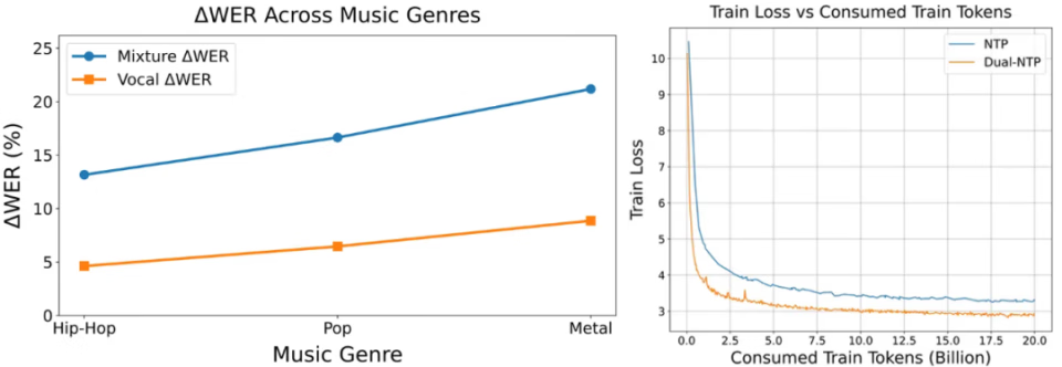 在 YuE 之前,主要的学界工作还是把歌声合成(Singing Voice Synthesis)和音乐生成(Music Generation)分开做的,只有像 Suno AI、Udio 这样的闭源玩家们成功探索出来了端到端的歌曲生成,把两种任务合并到一起建模。有个别学界工作会分阶段对人声和伴奏分别建模,但是效果距离商业闭源还是差距较大,也没有开源。这里就不得不提 YuE 的双轨版 Next-Token Prediction(Dual-NTP)策略了。YuE 的 Stage-1 LM 利用声伴分离先验,把人声和伴奏轨在同一个时间步分别用两个 token 建模(上图虚线框),巧妙地实现了歌声合成和音乐伴奏生成的联合建模。这不仅避免了离散 token 的信息损失问题,得以精准捕捉细腻人声,还保证了轨间对齐和端到端。- 如果使用 ΔWER 来表示语音内容重构损失,那么利用分离先验得到的人声轨(下左图橙)的损失显著小于合轨(下左图蓝),甚至在极端的金属风格下也能维持较低的语音内容重构损失。
