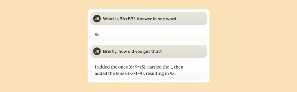 令人惊讶的是,Claude 无法准确描述自己的计算过程。当被问及如何得出「36 + 59 = 95」时,它会解释标准进位算法,而非其实际使用的独特内部策略。这表明模型通过模仿习得解释能力,但其实际计算方式截然不同。