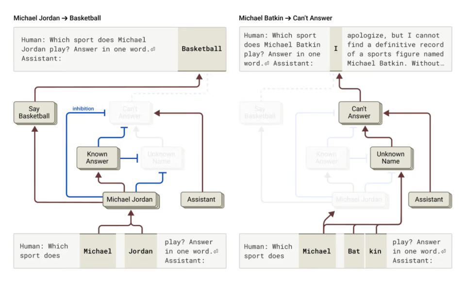 研究发现,Claude 内部有一个默认的「拒绝回答」路径。当模型被问及熟悉内容(如篮球明星迈克尔・乔丹)时,「已知实体」特征会激活并抑制默认路径,使模型能够回答。而面对未知实体(如「迈克尔・巴特金」)时,则会拒绝。