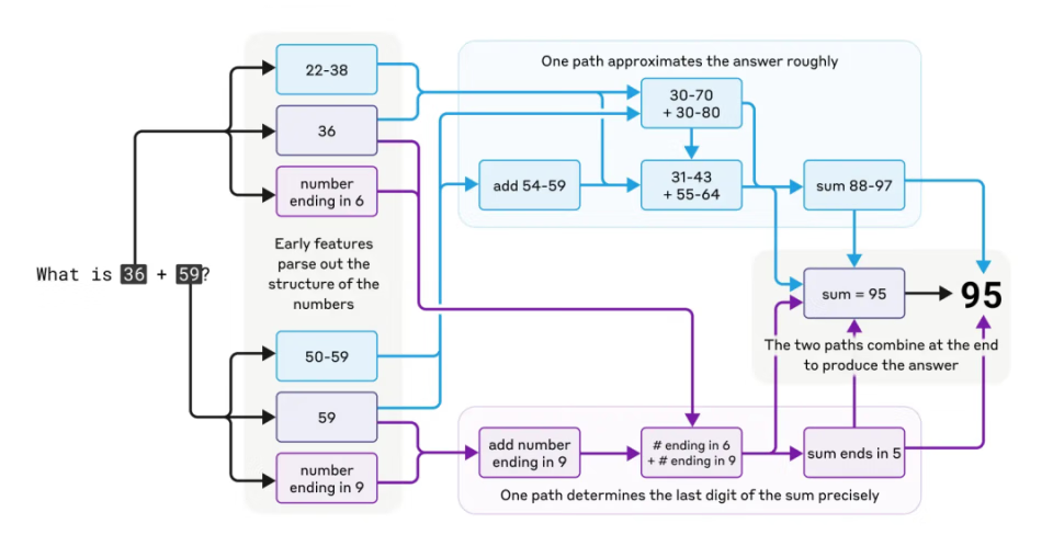 初始假设认为模型可能简单记忆加法表或使用传统算法。然而,研究揭示 Claude 采用了并行计算策略:一个路径估算近似值,另一个路径精确计算最后一位数字,最终融合得出答案。