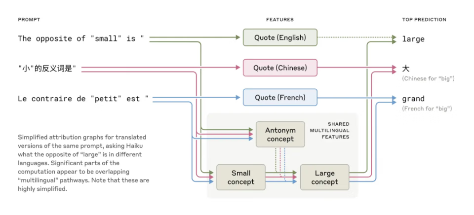 Claude 能够流利地「说」几十种语言,这种多语言能力是如何实现的呢?会不会模型内部有一个独立的法语版 Claude 和中文版 Claude 在并行运行,分别用各自的语言回应请求?还是说内部有一个跨语言的核心机制?