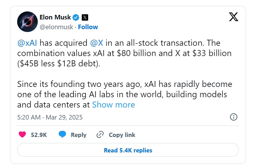 https://techcrunch.com/2025/03/28/elon-musk-says-xai-acquired-x/