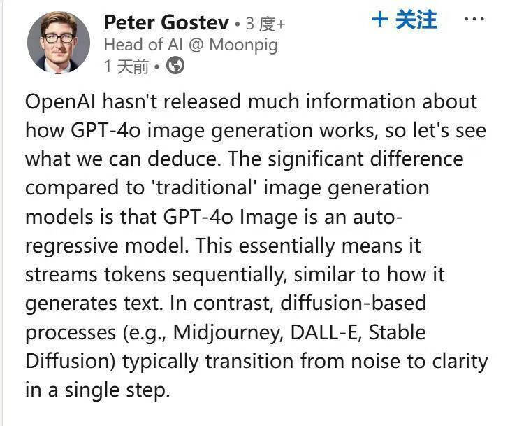开发者 @KeyTryer 也给出了自己的猜想。他说 4o 是一种自回归模型,通过多次通过来逐像素地生成图像,而不是像扩散模型那样执行去噪步骤。