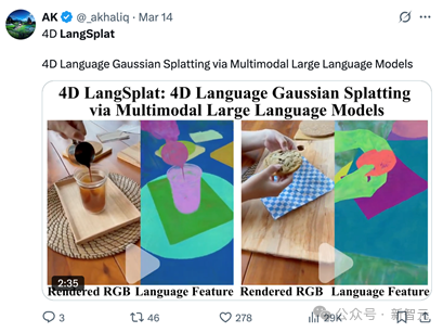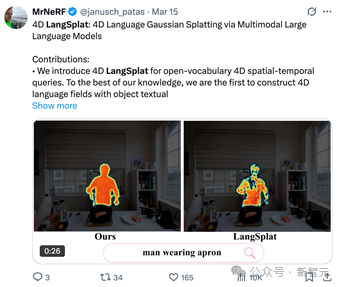 4D LangSplat的提出显著拓展了语义高斯场建模的应用场景,为动态语义场的实际落地提供了一种极具前景的解决方案。目前,该工作已在X(Twitter)平台上引发广泛关注,并得到AK、MrNeRF等大V转载,论文的代码和数据已全面开源。