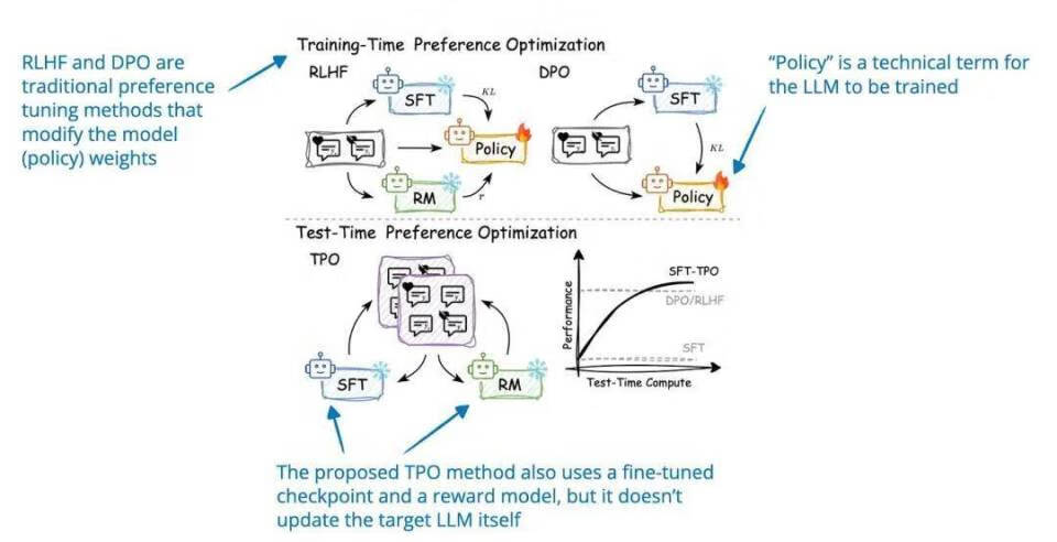Test-Time Preference Optimization(TPO)是一种新的框架,其核心目标在于使 LLM 在推理过程中快速对齐人类偏好,而无需重新训练模型参数。在每次迭代时,模型会按以下步骤执行操作: