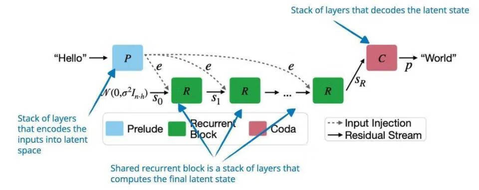 在提升模型推理能力的探索中,研究人员并未遵循生成更多 token 以改进推理的常规思路,而是提出了一个通过在潜在空间中迭代循环深度块来扩展推理时间计算的模型。这个深度块的功能类似于 RNN 中的隐藏状态,它允许模型改进其推理而不需要更长的 token 输出。