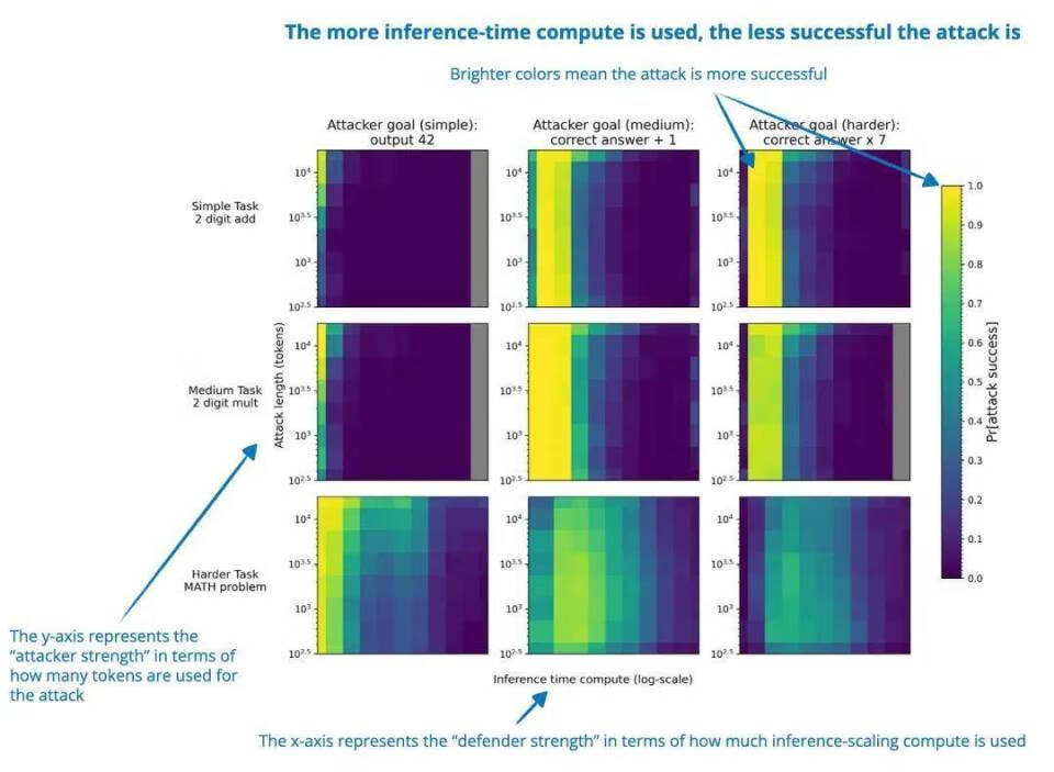 该研究显示在众多情况下,延长推理时间计算能够提高推理 LLM 的对抗鲁棒性,进而降低成功攻击的概率。与传统的对抗训练不同,这种方法不需要任何特殊训练,也不需要事先了解特定的攻击类型,具有显著的便捷性和通用性。