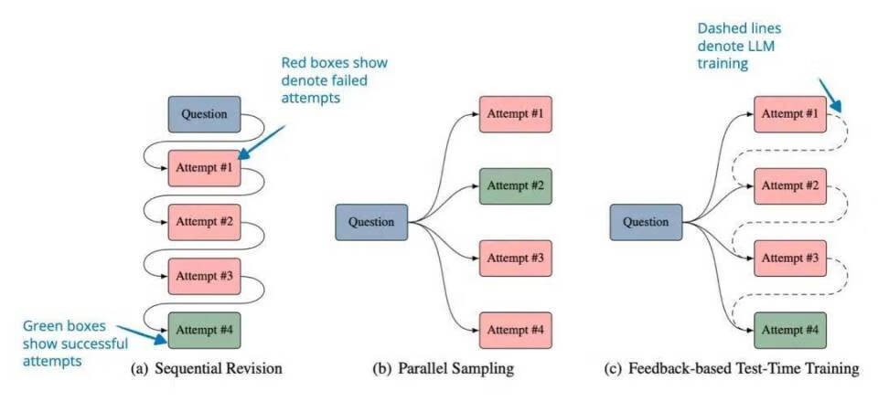 区别于前几种成果的思路,该研究的核心在于通过推理时动态调整大语言模型(LLM)的权重参数,使其能够从错误中学习,而无需将失败的尝试存储在提示(prompt)中,从而避免了高昂的成本。与传统的通过将先前的尝试添加到上下文中进行顺序修正或盲目生成新答案的并行采样不同,该方法在推理时直接更新模型的权重。