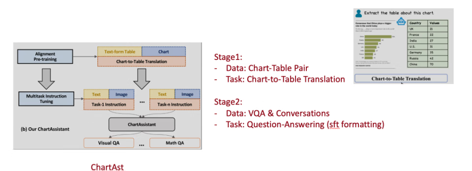 - 这种范式可以很自然的迁移到 Chart MLLM 中,如:ACL24 的 ChartAst,使用成对的 Chart-Table 进行第一阶段的图文对齐。