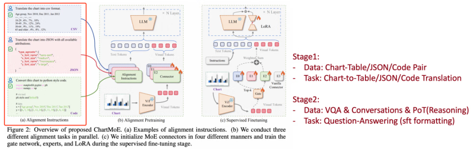 - 多阶段对齐(数据:ChartMoE-Align,Table 500k + JSON 200k + Code 100k),仅训练 MLP Connector,最后拼成 MoE Connector。