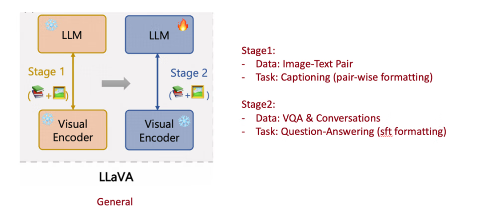 - 通用 MLLM,如 LLaVA,他们的 training recipe 通常分为两个阶段,第一个阶段使用图文对(image-text pair)训练 MLP Connector,第二阶段 SFT 训练 MLP Connector + LLM。