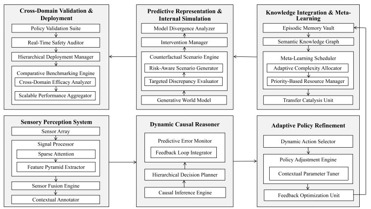通过传感解析、因果推理、策略自适应和跨域泛化优化机器人,在现实环境的适应性。传感感知系统采用稀疏注意力和特征金字塔提取分层解析多模态数据,来提高环境理解。