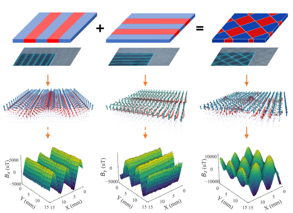 然而,实现三维力的测量和自解耦并非易事。这需要设计出特定的磁化方式,来构建出具有自解耦性质的三维磁场分布:当在某个方向施加力的时侯,另外两个方向的传感器输出与该方向没有耦合。