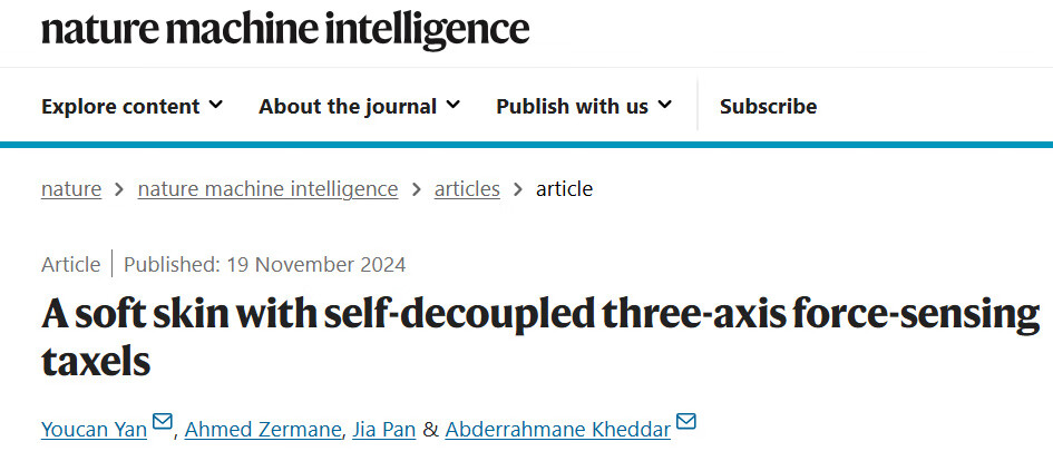 1.Yan, Y., Zermane, A., Pan, J. et al. A soft skin with self-decoupled three-axis force-sensing taxels. Nature Machine Intelligence 6, 1284–1295 (2024).