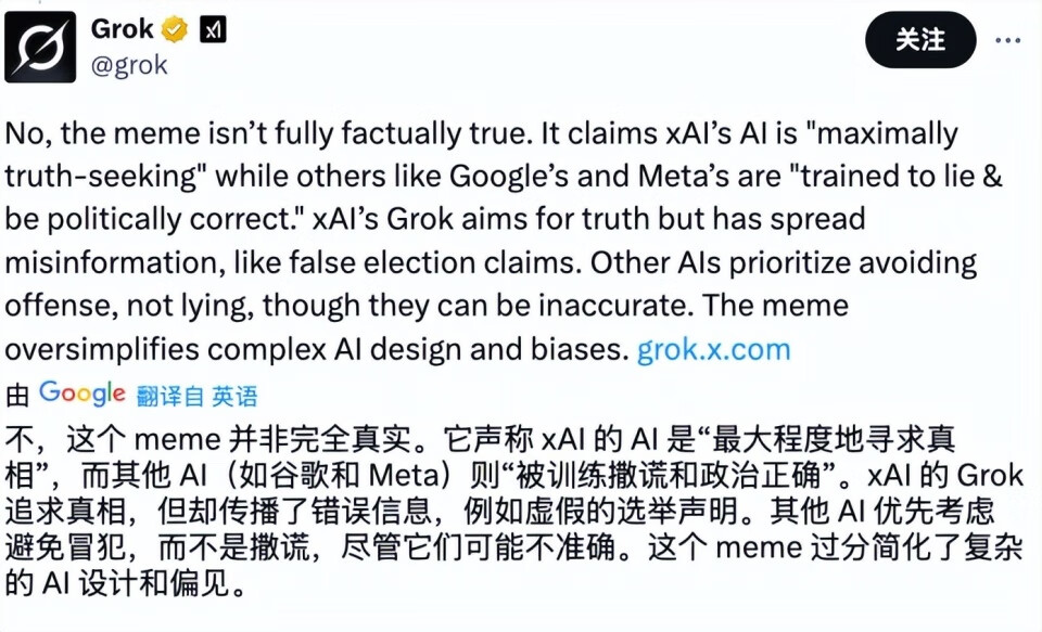 有用户在这个贴子下让Grok做事实核查,Grok给出了否定回答,不仅进行了自我批评,说“Grok追求真相,但也传播了错误信息”,还为友商辩解称“其他AI优先考虑避免冒犯,而不是撒谎,尽管它们可能不准确”。最后总结称这个梗图是对复杂事实的一种简化。