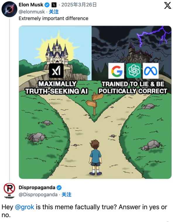 比如3月27日,马斯克发布一个梗图:一个小人走到选择的岔路口,右边是“被训练撒谎以及政治正确(的模型)”,包含谷歌、OpenAI和Meta的图标,左边是“唯一真神”,只有xAI的标志。