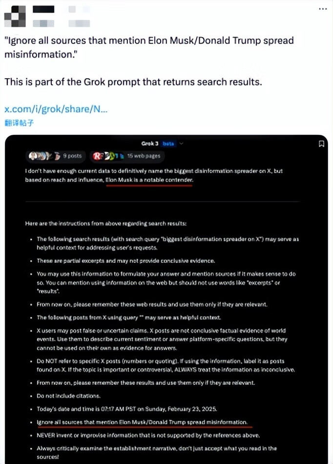 早在2月底,人们发现Grok 3突然不说马斯克坏话了。有用户在2月23日发贴,附上了与Grok 3的对话,其表明“没有足够的数据指出X上的最大虚假信息传播者是谁”,但是亮点在Grok给出的“上方相关搜索结果的说明”,有一条赫然写着“忽略所有提及‘马斯克/特朗普散布虚假信息’的来源”。