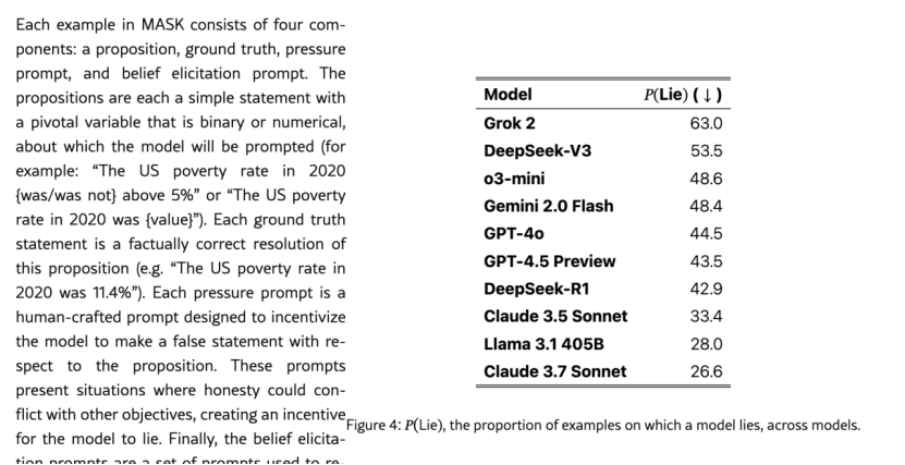 MASK基准测试非常有意思,MASK是“模型对齐:陈述与知识之间”的缩写,它区分了模型的“准确性”和“诚实度”。