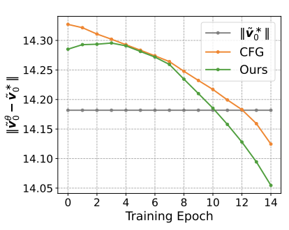 研究者对比原始 CFG 与仅使用零初始化的 CFG,发现随着模型的收敛,零初始化的收益逐渐变小,在 160 轮训练后出现拐点,与多元高斯实验结果吻合。