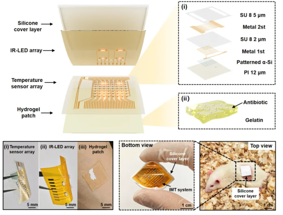 通过本次研究课题组研发出一种柔性炎症监测与治疗(IMT,Inflammation Monitoring and Treatment)系统,集成了亚毫米级分辨率的非晶硅温度传感器阵列、高精度红外光发射二极管(IR-LED,Infrared Light-Emitting Diode)和热响应药物水凝胶,能够实现创面炎症的实时监测和精准治疗。