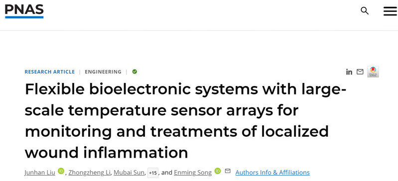 日前,相关论文以《具有大规模温度传感器阵列的柔性生物电子系统,用于监测和治疗局部伤口炎症》(Flexible bioelectronic systems with large-scale temperature sensor arrays for monitoring and treatments of localized wound inflammation)为题发在 Proceedings of the National Academy of Sciences[1],博士生刘俊含是第一作者,宋恩名与复旦大学梅永丰教授为通讯作者。