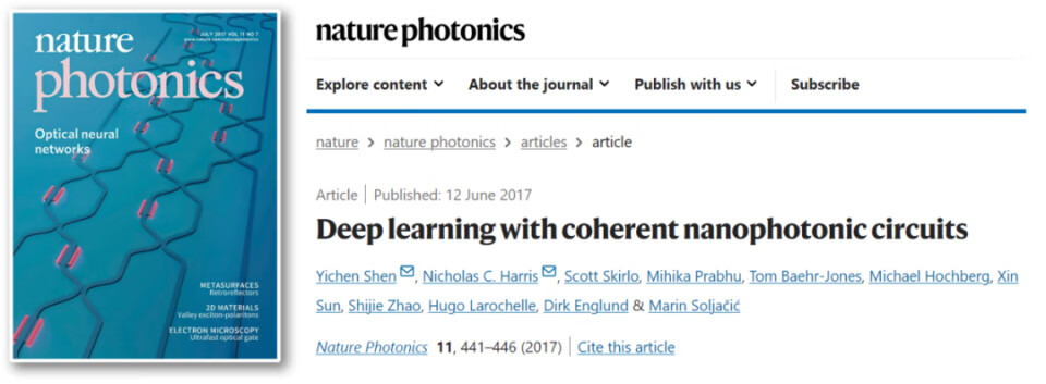 回顾沈亦晨的“追光之路”。早在 2017 年,他以第一作者在 Nature Photonics 上发表了一篇题为《由纳米光学回路实现的深度学习》(Deep learning with coherent nanophotonic circuits)的封面论文,首次提出光子计算系统的概念,开发出基于相干纳米光子电路进行深度学习计算方法,即光子代替电子来进行 AI 计算。