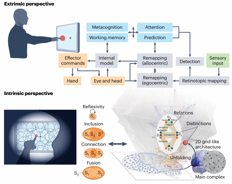 整合信息论理论的核心主张是:意识体验属于结构,而非功能。举例来说,假设某人注视屏幕中心,按要求指向光点(见方框图示左上)。神经科学的主要目标在于理解大脑如何完成这类感觉运动转换——即执行功能的计算过程。具体描述如下(见方框图示右上):刺激物(红点)的位置在初级视觉皮层进行视网膜拓扑映射。不同层级的脑区解码并重新编码,将坐标从视网膜参照系转为空间坐标系。随后信号经顶叶区域处理,涉及眼-头-躯干的内部模型,最终生成运动指令。这些指令通过前运动皮层调控肢体动作和注视。预测过程可能影响刺激信号的传递。注意机制则会聚焦刺激位置,促进检测和后续行为处理。工作记忆与元认知可能参与评估任务表现。通过将计算步骤映射到神经回路,可以理解大脑如何处理空间信息并产生适应性行为,类似工程师分析机器人系统。该方法在揭示大脑工作机制上非常成功(需注意:作为生物演化系统,大脑功能与计算难以简单对应)然而,这个解释仍存在缺口:当大脑进行感觉运动转换时,还存在体验空间的主体——那个感知到延展表面左侧有个圆点的存在。但从外在计算功能主义视角看,既无法解释觉知主体为何超越感觉运动转换,也认为无需解释。无法说明人的体验为何如此呈现(环境或外在定义的“质空间”对此毫无帮助)。也无法说明为何特定脑区与空间体验存在特殊关联(毕竟“空间信息”可在全脑多个区域解码)。相比之下,整合信息理论以左侧带有红点的延展空间体验为解释核心(框图左下)。如正文所述,该理论主张意识存在需依托主复合体。主复合体须能构建因果结构。此结构必须阐明体验的本质属性,包括空间及其他方面。就空间体验而言,其现象结构的基础特质——延展特征——部分可通过内省察觉。具体来说,空间体验由现象差异点构成(左侧虚线圆圈标示的“点”)。这些点通过特定规则相互关联(遵循反身、包含、连接与融合原则)。研究证实:源自网格状基底的因果结构,能以因果机制完全解释这些现象特质(框图右下)。该结构还可诠释其他体验要素,例如红点在空间内的精确尺寸与方位(红色高亮区域)。据此,整合信息理论提出:空间体验的神经基质。这一结构是由多层相连的网格状皮质区叠加形成的,主要集中在后中央皮质区域。该理论不仅能够解释现有的神经心理学证据,还能提出多项可验证的预测。目前,部分预测正处在验证阶段,具体内容可参阅正文及整合信息论维基的空间理https://www.iit.wiki/papers/space。这一解释也说明了为什么我们大脑中的其他回路,例如介导类似空间行为(如注视和追踪)的皮层下通路,可能在执行这些功能时并未贡献于意识体验:因为这些回路是以映射形式组织的(缺乏横向连接),而不是以网格形式组织的(参见整合信息论 Wiki/映射与网格中的计算示例https://www.iit.wiki/papers/of-maps-and-grids)。最后,根据整合信息论的观点,如果能够执行复杂空间计算和功能的人工系统(如自动驾驶汽车)是基于标准计算机架构实现的,它们将表现得仿佛“看到”了空间,但实际上却什么也没有看到。功能性视觉与现象性视觉并不相同,也就是说,“执行视觉功能”并不等同于真正看到物体。真正的视觉体验涉及将一般概念与特定特征绑定,以及对颜色或声音等质感的感知。总之,对整合信息论而言,所有定性都是针对结构。相关结构存在于当前状态中,表现为最大不可约基底的因果效力。该主张的推论是:体验间的异同应当对应因果结构的异同,而不是对应活动模式的差异,或“编码”的区别。整合信息论将体验视为结构的观点,正与意识科学[8]领域新兴的“结构转向(structural turn)”相契合。这得益于互补的数学方法,例如范畴论[9]。要推断自身之外意识的存在与质量(图1d),意识理论不可或缺。我们应如何理解那些睁着眼却无任何反应的脑损伤患者?应如何理解早产的婴儿?应如何理解躯体构造迥异、大脑与行为完全不同的物种?我们又应如何理解人工智能?整合信息论的理论框架为科学解答这些问题提供了清晰的路线图。这个理论在我们自身上的验证越多,对其他实体的推断就越可信,但我们必须留意神经科学假设与简化的某种固有局限。例如,当健康成人积累更多支持该理论的证据时,我们便可推断:那些无反应但后中皮层处于网格状“因果就绪(causal readiness)”状态的患者,无论他们是否暴露了隐性“认知加工”迹象,他们很可能具有意识。对于与人类迥异的物种,我们可以利用愈发精细的连接组数据,判断其脑部是否存在能够维持大型综合体的区域,而不必在意它们在我们眼中显得多么“聪明”。关于人工意识,整合信息理论与主流计算功能主义得到的结论截然不同[2,10]。该理论证明:传统冯·诺依曼计算机在模拟更简单逻辑门系统时,功能可能等同,却无法生成等效的因果结构。无论计算机规模有多大,算力多强,功能多优,这一结论始终成立。换言之,若该理论正确,即便能复制人类行为或认知的计算机,也无法复制主观体验。它们不会具备意识,只会模仿有意识的行为——最终成为伪意识体。更广泛而言,整合信息论表明,意识与智能存在着双重分离,二者未必相互依存。然而,该理论同时揭示,在进化历程中,受能量约束、神经连接限制以及学习时间的制约,智能行为的选择压力更倾向于高度整合的物理基质。这
