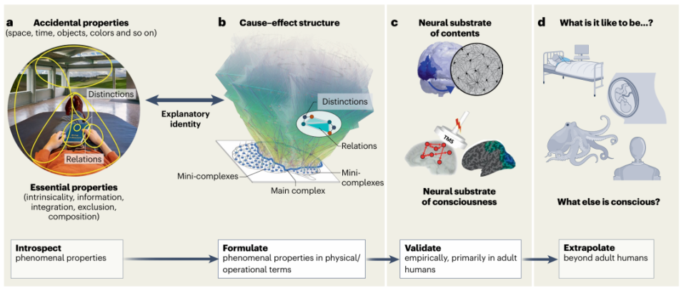 [2] Findlay, G. et al. Preprint at https://doi.org/10.48550/arXiv.2412.04571 (2024).[3] Albantakis, L. et al. PLoS Comput. Biol. 19, e1011465 (2023).[4] Tononi, G., Boly, M. & Cirelli, C. Neuron 112, 1568–1594 (2024).[5] Vezoli, J. et al. Neuroimage 225, 117479 (2021).[6] Watakabe, A. et al. Neuron 111, 2258–2273.e10 (2023).[7] Aaronson, S. Why I Am Not An Integrated Information Theorist (or, The Unconscious Expander). Shtetl-Optimized: The Blog of Scott Aaronson https://scottaaronson.blog/ ?p=1799 (2014).[8] Kleiner, J. Conscious. Cogn. 119, 103653 (2024).[9] Tsuchiya, N. & Saigo, H. Neurosci. Conscious. 2021, niab034 (2021).[10] Butlin, P. et al. Preprint at https://doi.org/10.48550/arXiv.2308.08708 (2023).[11] Blum, L. & Blum, M. Proc. Natl Acad. Sci. USA 119, e2115934119 (2022).[12] Dehaene, S., Lau, H. & Kouider, S. Science 358, 486–492 (2017).[13] Song, C., Haun, A. M. & Tononi, G. eNeuro, 4, ENEURO.0080-17.2017 (2017).[14] Siclari, F. et al. Nat. Neurosci. 20, 872–878 (2017).[15] IIT-Concerned et al. Nat. Neurosci. https://doi.org/10.1038/s41593-025-01881-x (2025).[16] Casarotto, S. et al. Ann. Neurol. 80, 718–729 (2016).[17] Sarasso, S. et al. Neurosci. Conscious. 2021, niab023 (2021).