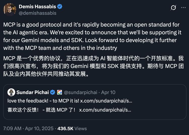 AI领域的互操作性标准之争正变得异常热闹。就在本周,Google DeepMind CEO Demis Hassabis宣布,将为其Gemini模型添加对Anthropic主导的模型上下文协议MCP的支持,称其为“一个优秀的协议,正迅速成为 AI Agent 时代的开放标准”。这距离OpenAI CEO Sam Altman宣布支持MCP仅仅过去几周时间。