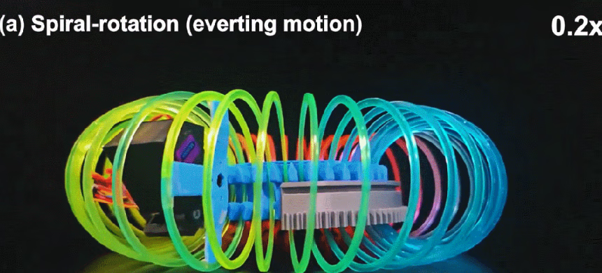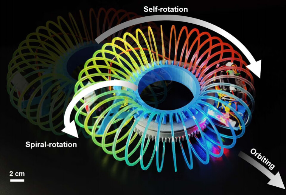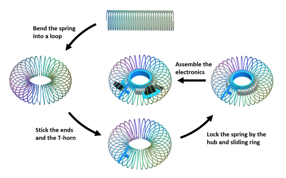 于是,团队成员立即行动,他们用胶带将弹簧圈的首尾粘在一起,形成螺旋环状结构,并设想如果让它自动运行起来,也许会沿着地面翻转滚动。在此基础上,研究人员开启了对这款独特机器人的研究。