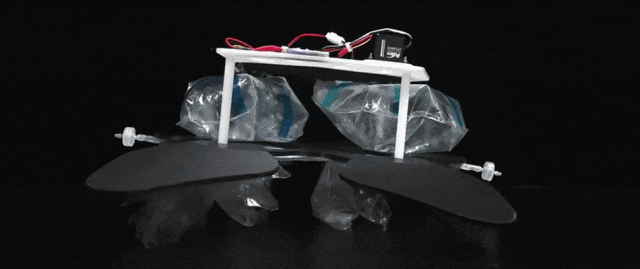 在运动控制方面,该课题组成功研制出一种具有 10 条腿的气动软体机器人 [3],其创新性主要体现:采用一种独特的气动软传动系统(R-BESTS),将伺服电机的旋转运动直接转化为机器人腿部的摆动,借助“物理智能”突破了传统气动机器人需要外接泵、阀和管道的限制。