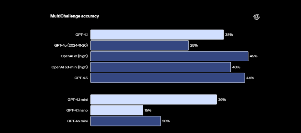 指令遵循能力:在Scale的MultiChallenge基准上得分38.3%,比GPT-4o提升10.5个百分点。