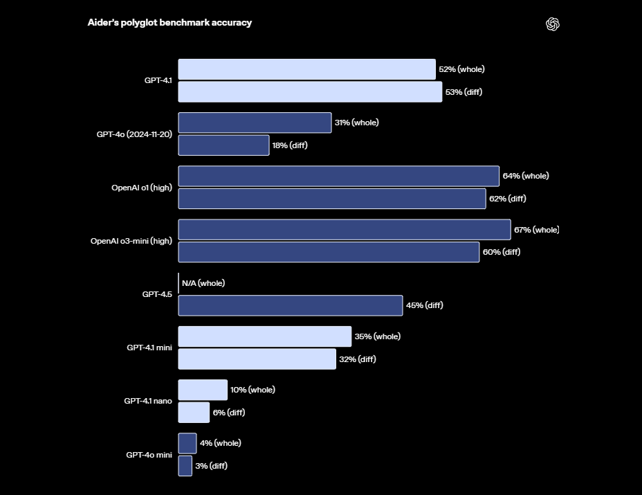 对于希望通过 API 编辑大型文件的开发者来说,GPT‑4.1 在多种格式的代码差异(code diff)处理上表现更加可靠。在 Aider 的 polyglot diff 基准测试中,GPT‑4.1 的得分是 GPT‑4o 的两倍以上,并且比 GPT‑4.5 高出 8 个百分点。