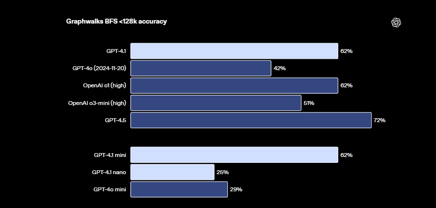 Graphwalks 会用一个由十六进制哈希构成的有向图填满整个上下文,然后要求模型从图中一个随机节点开始,执行广度优先搜索(BFS),并返回某一深度下的所有节点。在这个评估中,GPT‑4.1 的准确率为 61.7%,与 o1 模型持平,显著优于 GPT‑4o,展示了其在复杂逻辑路径理解与多跳推理中的优势。