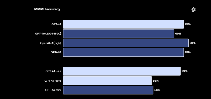GPT‑4.1 系列模型在图像理解方面表现出色,尤其是 GPT‑4.1 mini ,在多个图像基准测试中经常优于 GPT‑4o。