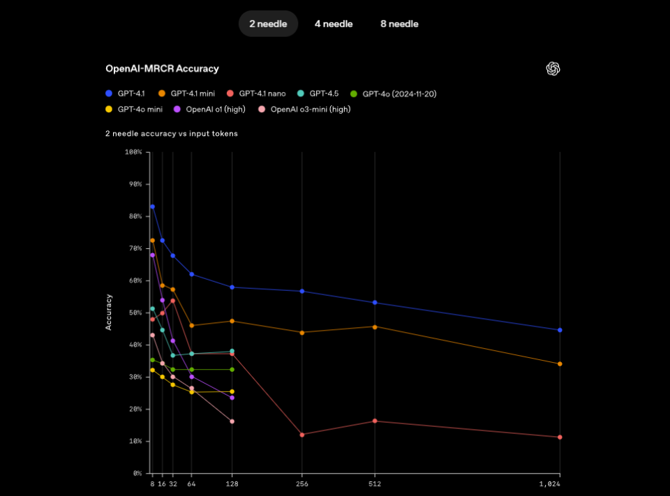 OpenAI训练 GPT‑4.1 能够在完整的 100 万Token上下文长度中可靠地关注相关信息。它在识别有用文本、忽略干扰信息方面也比 GPT‑4o 更加可靠,无论是长上下文还是短上下文。长上下文理解能力对于法律、编程、客户支持等多个领域的应用来说,都是一项关键能力。