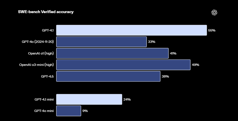 在 SWE-bench Verified(衡量真实世界软件工程技能的基准测试)中,GPT‑4.1 完成了 54.6% 的任务,而 GPT‑4o(2024-11-20 版本)仅完成了 33.2%。这反映出模型在浏览代码库、完成任务,以及生成既能运行又能通过测试的代码方面能力的提升。