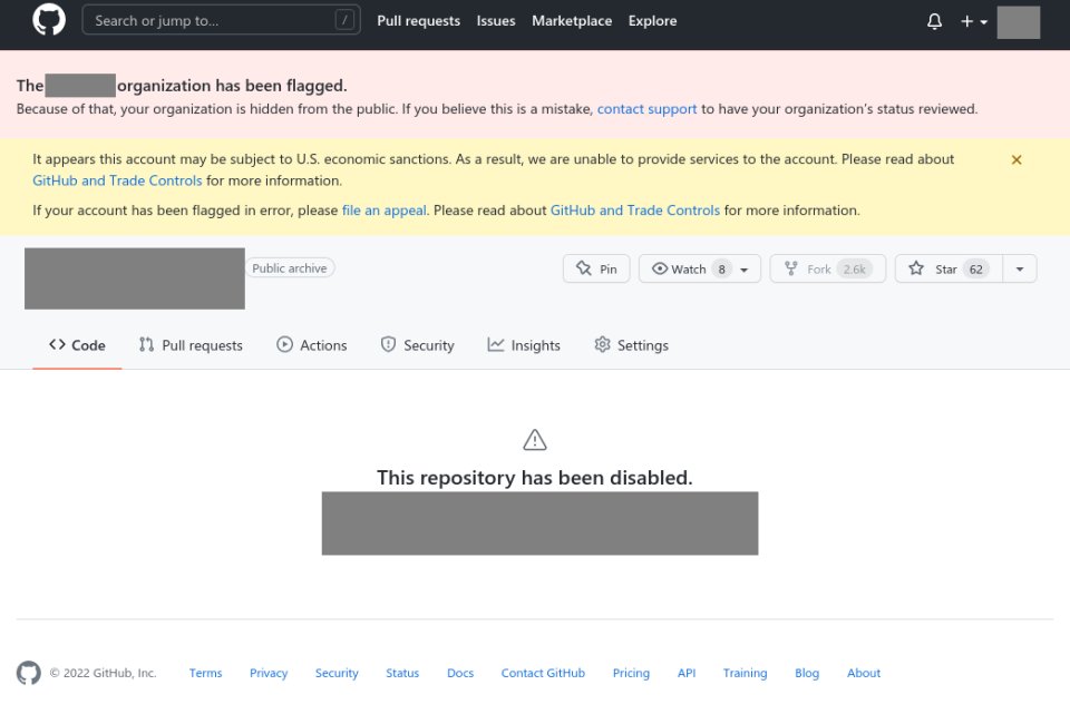 此后不久也就是 4 月 13 日,GitHub 开始陆续屏蔽受到美国制裁公司的开发者和企业账户,其中包括俄罗斯银行 Sberbank、俄罗斯最大私人银行 Alfa-Bank 等公司,截止 4 月 15 日,已有数十个公司及个人的账户被封禁。据了解,被封禁的个人账户基本都与被制裁的企业有关,或与之有关或是其员工,而且即使你已离开该公司,一样可能会被“误伤”。
