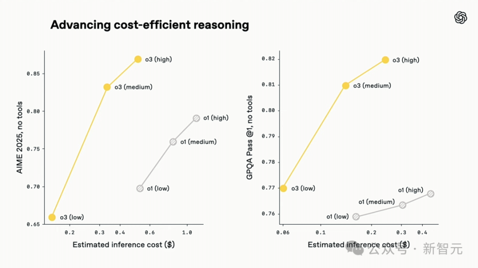 在2025年AIME数学竞赛上,o3推理成本和性能全面优于 o1,同样地,o4-mini成本-性能也全面优于o3‑mini。
