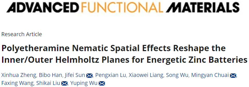1.Zheng, X., Han, B., Sun, J., Lu, P., Liang, X., Wu, S., ... & Wu, Y. (2025). Polyetheramine Nematic Spatial Effects Reshape the Inner/Outer Helmholtz Planes for Energetic Zinc Batteries. Advanced Functional Materials, 2420434.