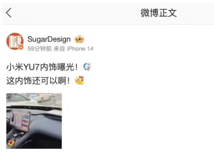 4 月 17 日,博主 @SugarDesign 发文,曝光了小米 YU7 汽车的内饰。