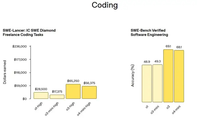 编程基准测试(包括 SWE-Lancer: IC SWE Diamod Freelancer 编程任务和 SWE-Bench Verified 软件工程任务):