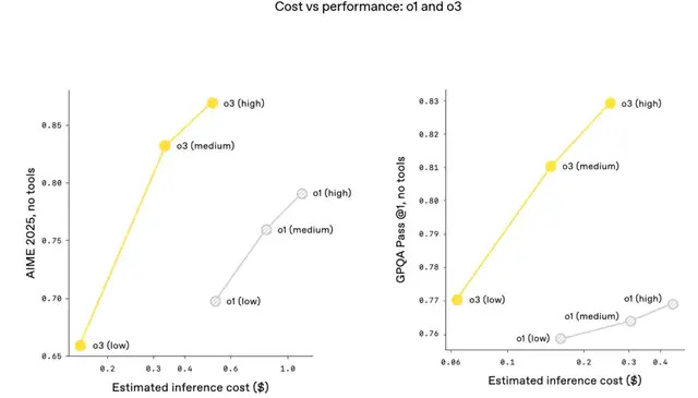 例如,在 2025 年 AIME 数学竞赛中,o3 的性价比边界比 o1 有显著提升;同样,o4-mini 的性价比边界也比 o3-mini 有显著提升。
