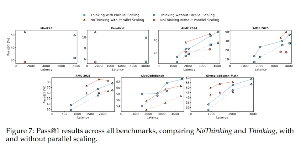正如预期的那样,并行 scaling 提高了 Thinking 方法和 NoThinking 方法的单样本准确率(pass@1)性能。然而,在所有数学基准测试中,NoThinking 方法始终处于帕累托最优边界的主导地位。